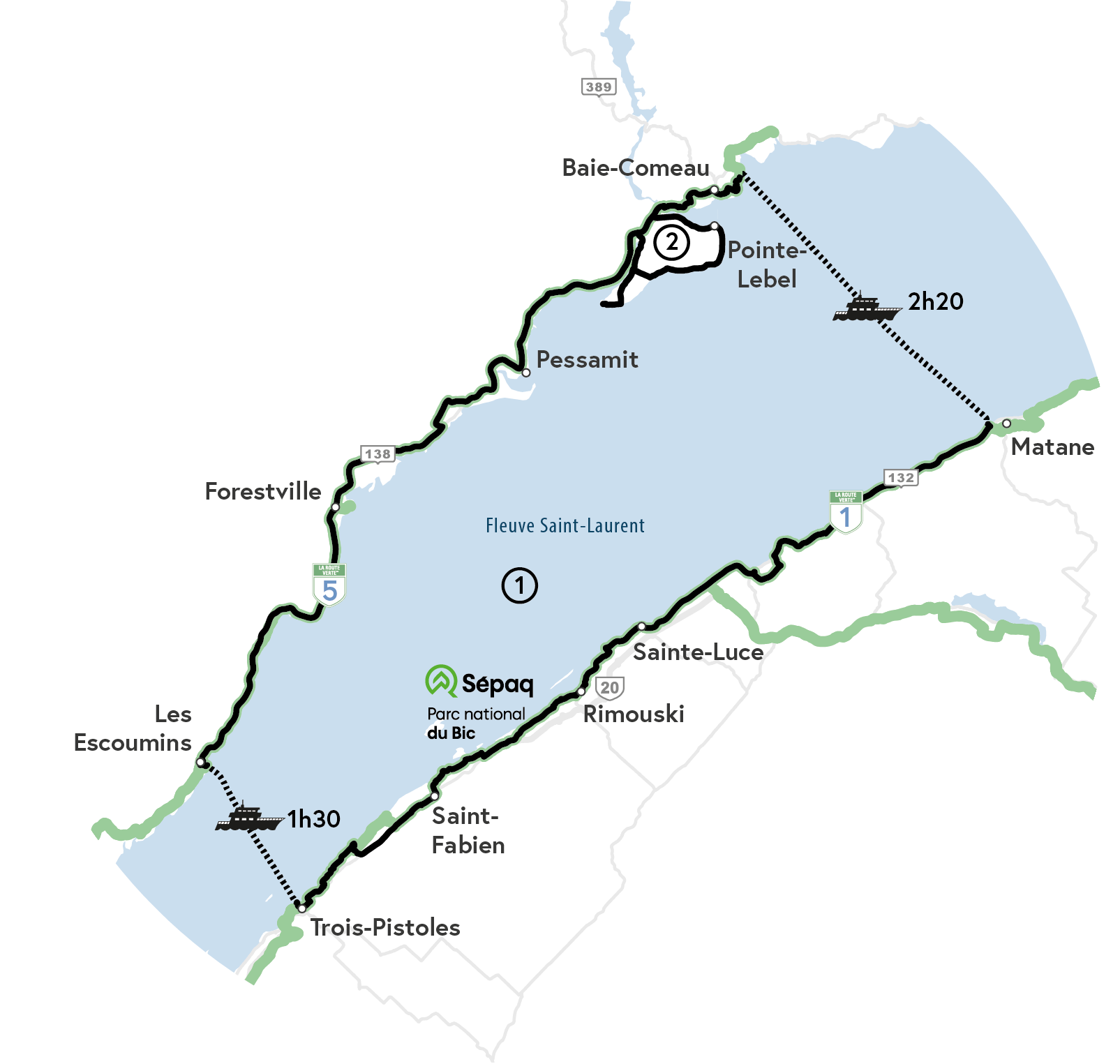 D’un côté, la Route des Baleines et la Péninsule Manicouagan, de l’autre, la Route des Navigateurs et le Parc national du Bic. Entre les deux, le Saint-Laurent à perte de vue et trois lignes de traversiers pour en découvrir les deux rives!